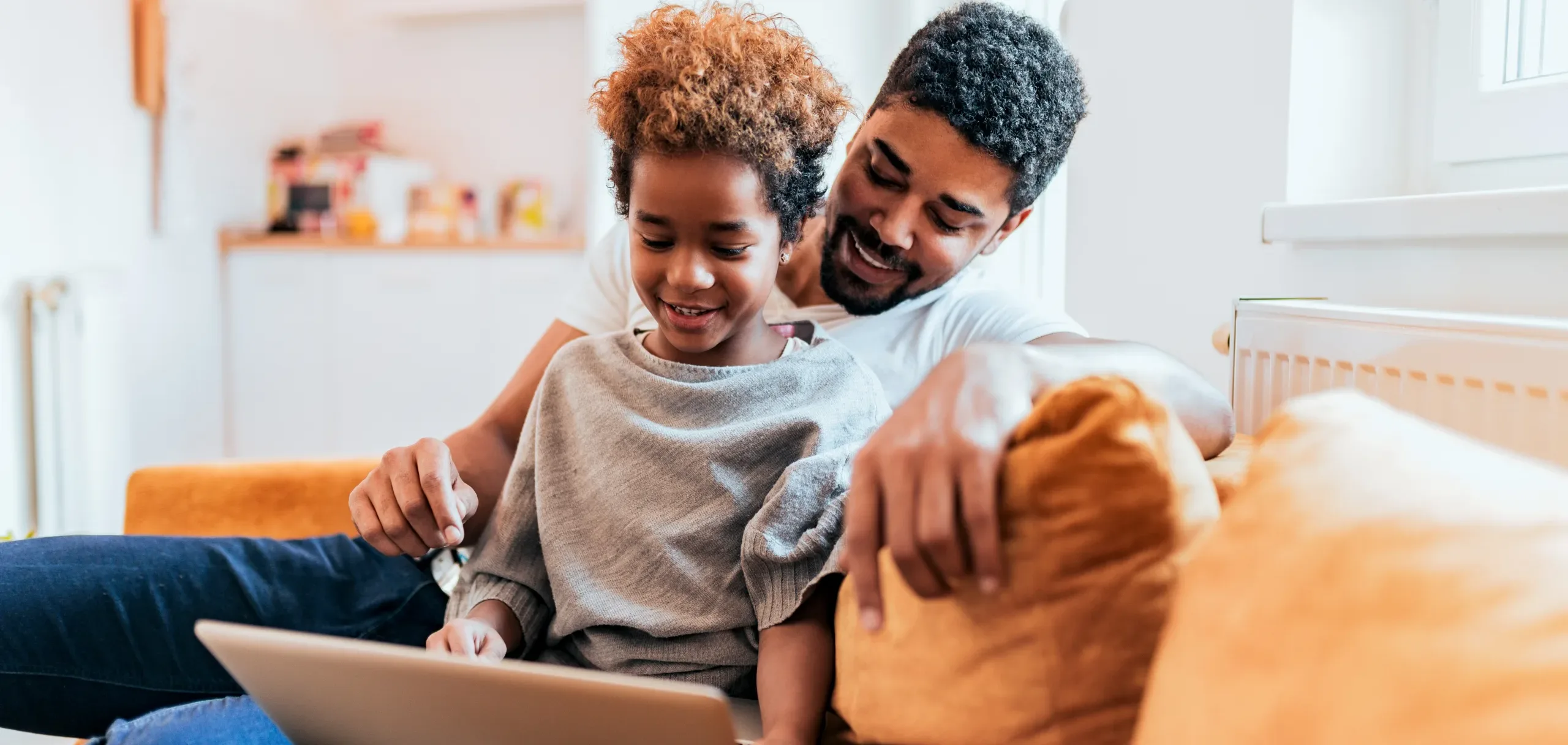 Father and daughter using laptop together at home.